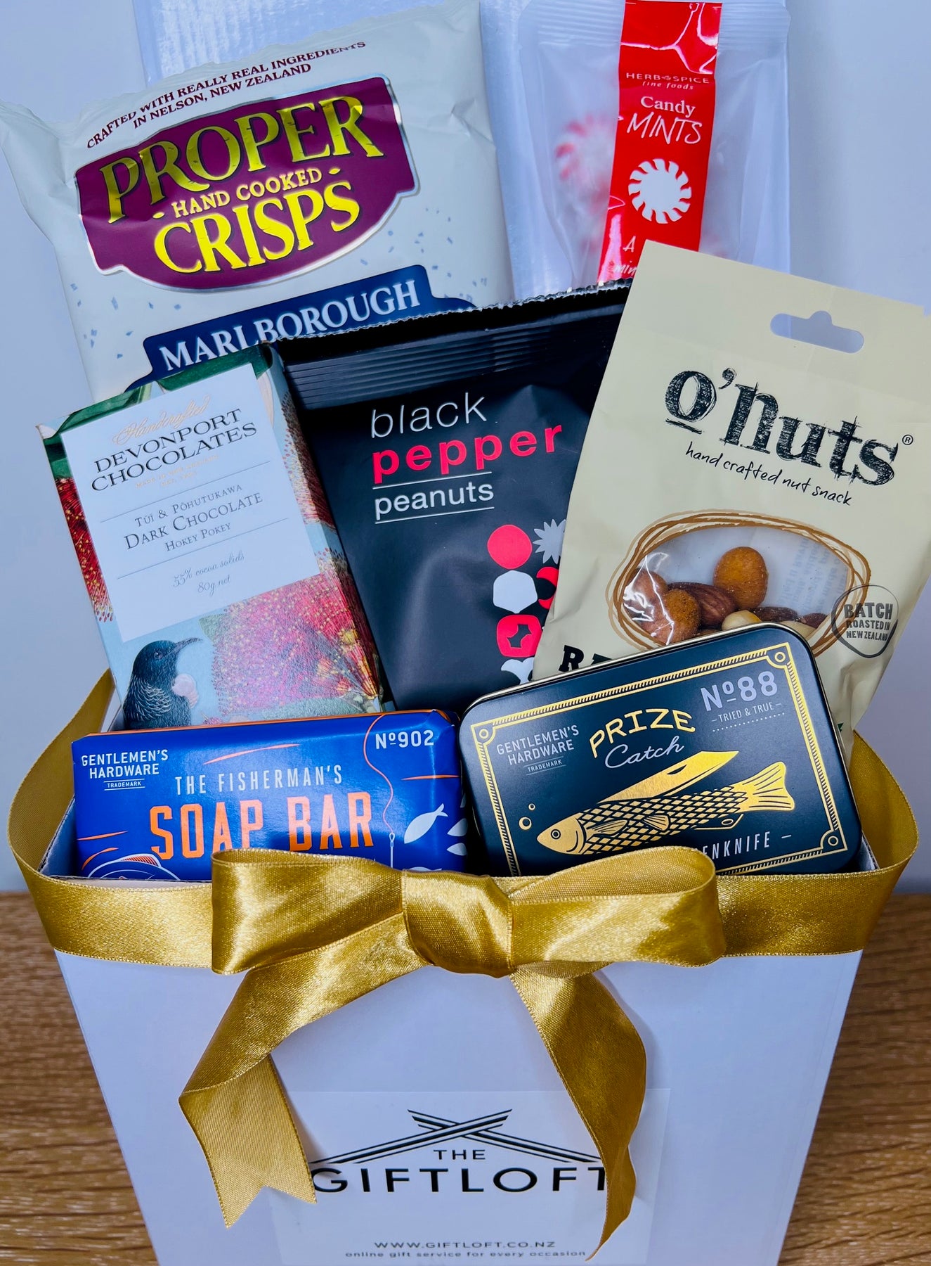 A quirky and fun gift for men of all ages! A birthday or Christmas present for Dad, a son, or a unique corporate gift for a client or employee. All enclosed in a hamper style box with bespoke ribbons. Add your message to the free swing tag gift card.