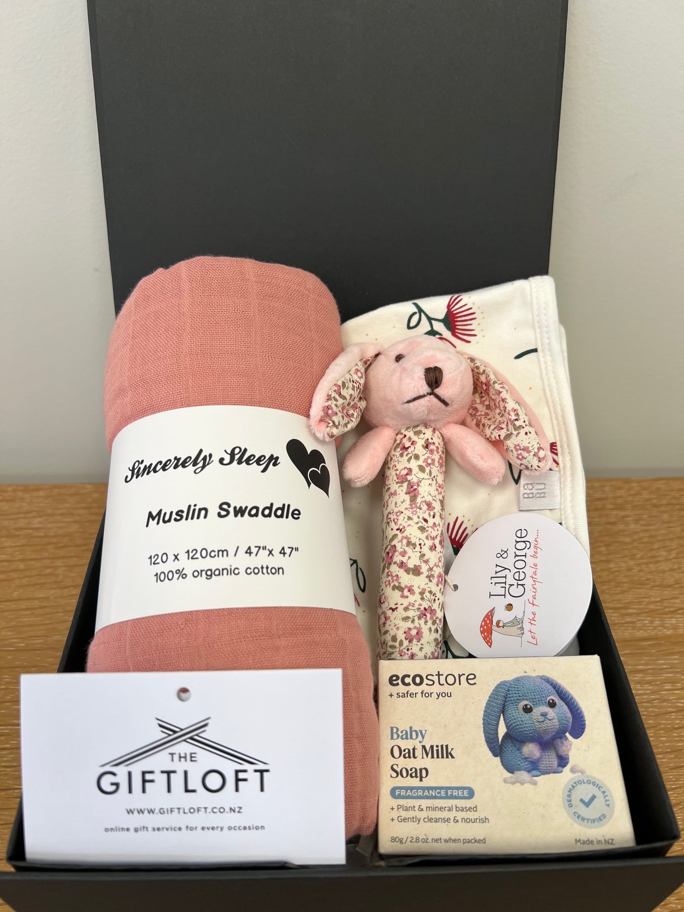 - Sincerely Sleep Swaddle 100% organic cotton (120cm x 120cm) in two colours: either Soft Grey or Sweet pink;